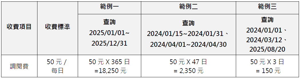 - 以日為單位,一日查詢單價為50元,乘以查詢日數計算調閱費。